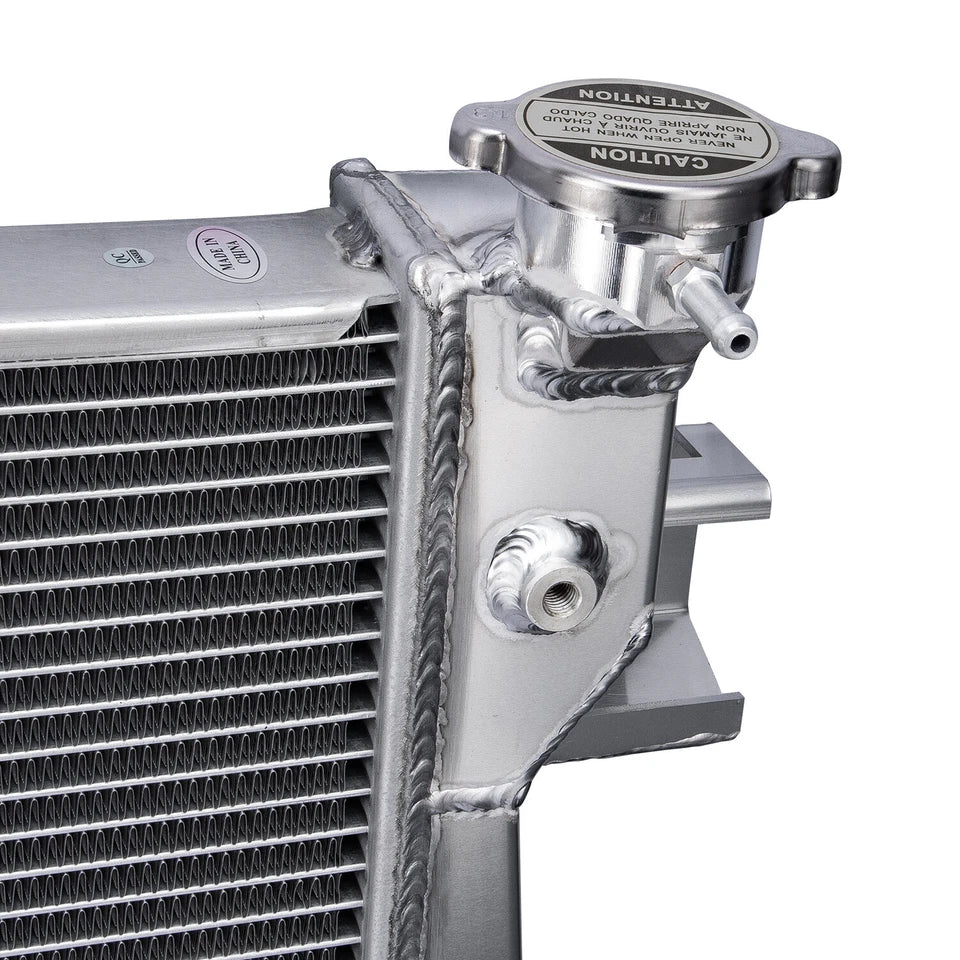 This aluminum radiator is designed to provide maximum cooling efficiency to prevent premature engine failure. Its light-weight, and high-heat transferring aluminum features a tube and fin design that, dramatically increases surface area that enables the heat to dissipate more efficiently. This Aluminum Radiator is at least 40% more efficient than stock ones. Most importantly, it has a much higher capacity for coolant than stock ones, which means that your cooling system will be more efficient and will be more resistant to temperature surges in racing applications.