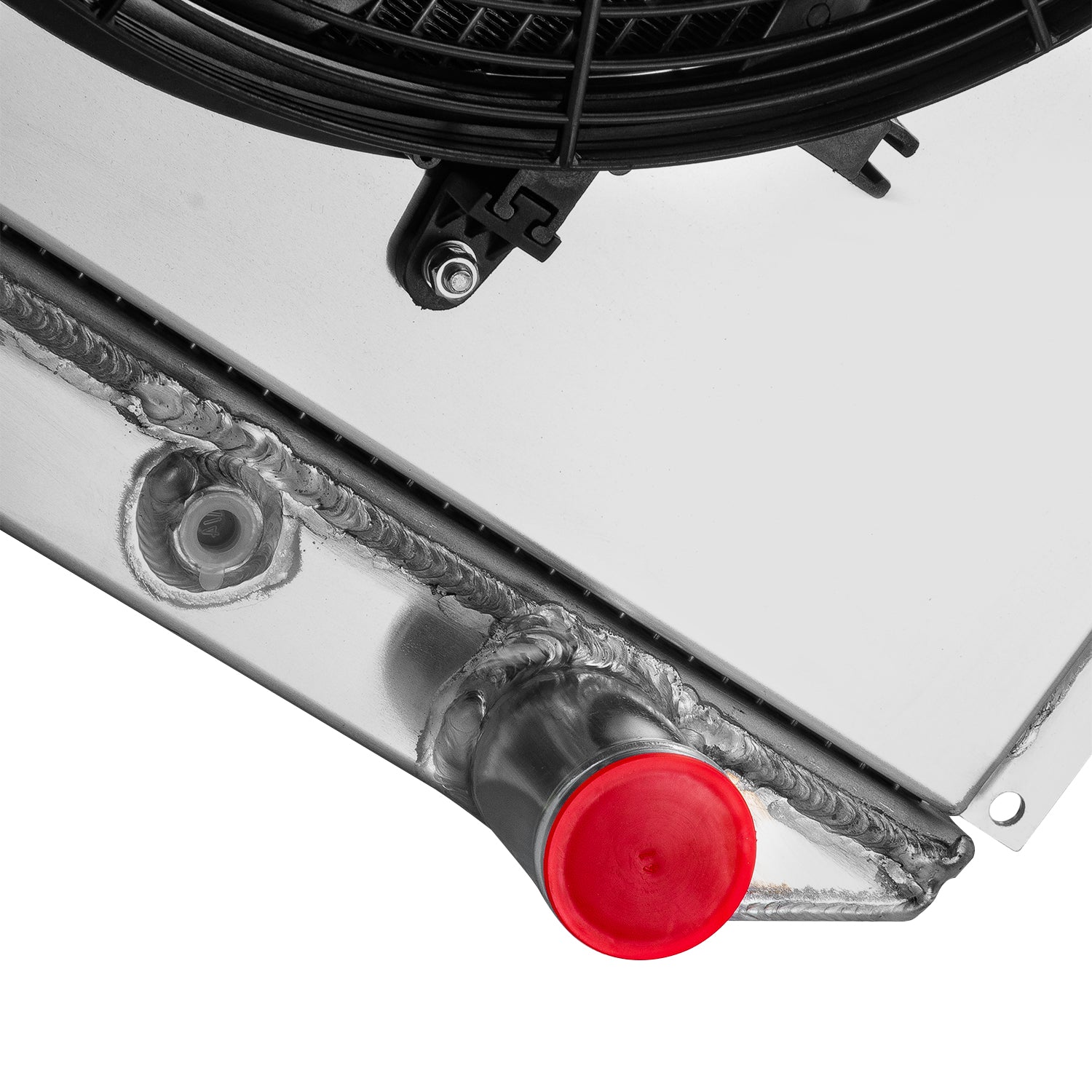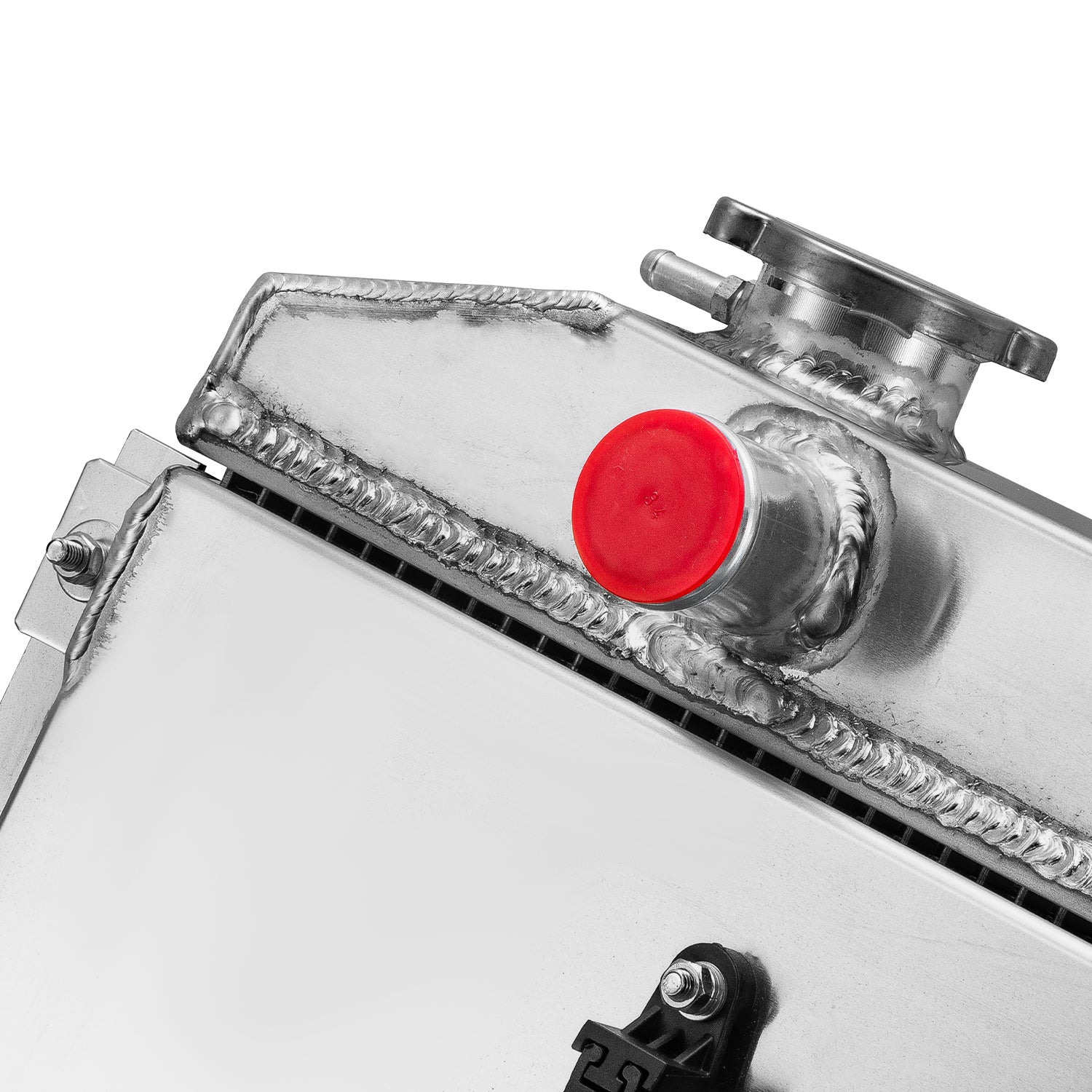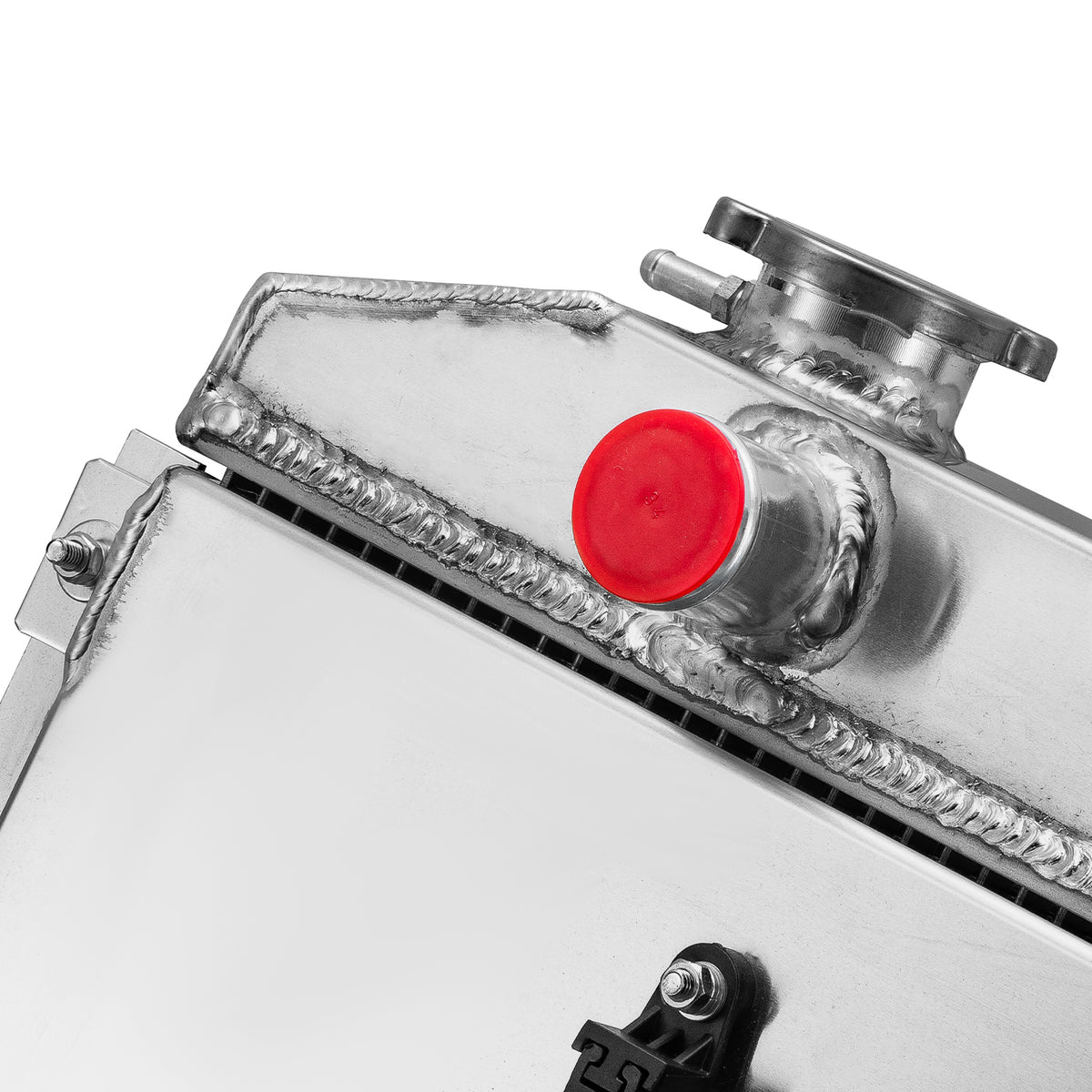 This aluminum radiator is designed to provide maximum cooling efficiency to prevent premature engine failure. Its light-weight, and high-heat transferring aluminum features a tube and fin design that, dramatically increases surface area that enables the heat to dissipate more efficiently. This Aluminum Radiator is at least 35% to 45% more efficient than stock ones. Most importantly, it has a much higher capacity for coolant than stock ones, which means that your cooling system will be more efficient and will be more resistant to temperature surges in racing applications.